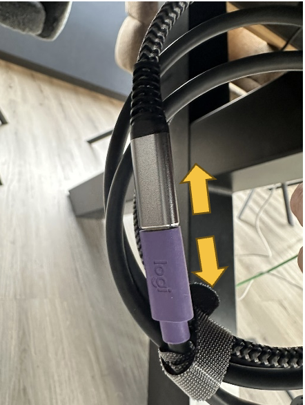 Dann sollte es klappen. Hat das System das Notebook erkannt, kann die ursprüngliche Verbindung wiederhergestellt werden Lila Stecker kommt dann wieder in die silberne Buchse und auf dem Tisch das USB-C-Kabel in das Notebook.