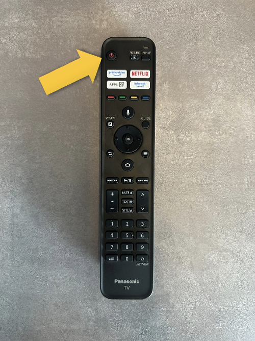 Auf der Fernbedienung des Fernsehers den „An/Aus“-Knopf drücken und warten bis der Fernseher an geht.